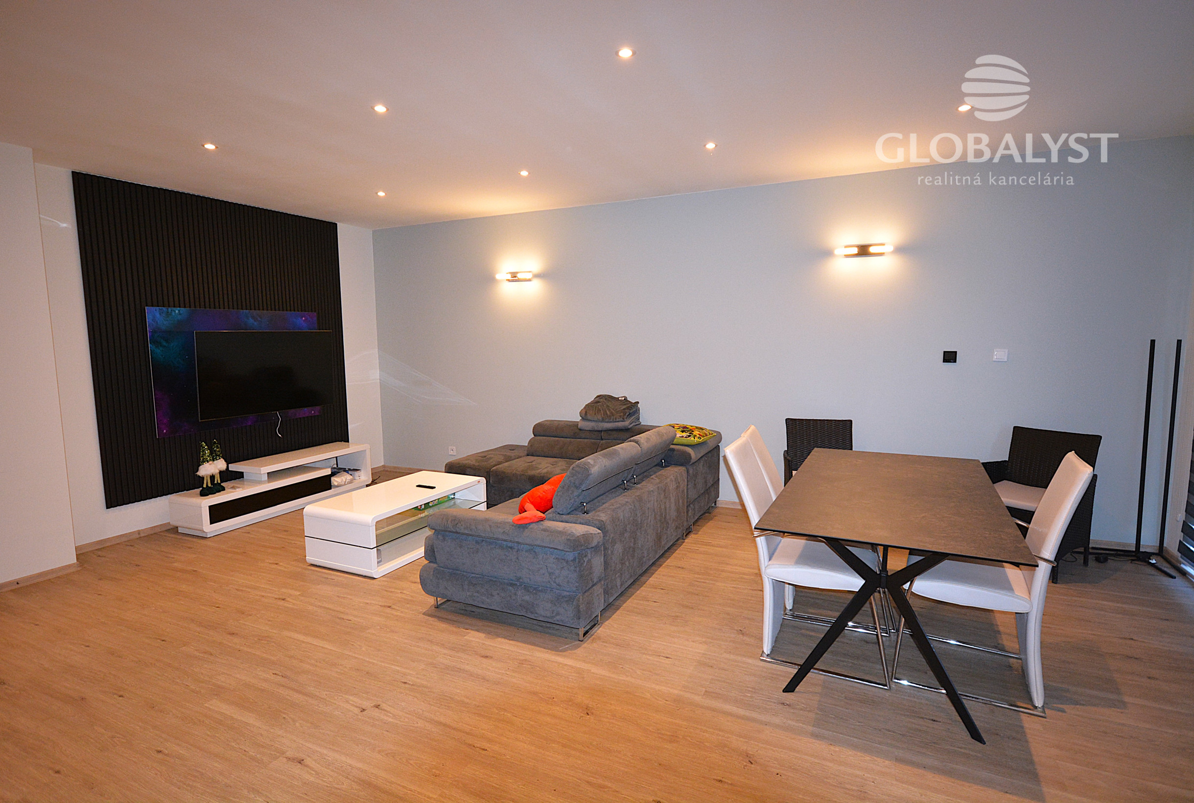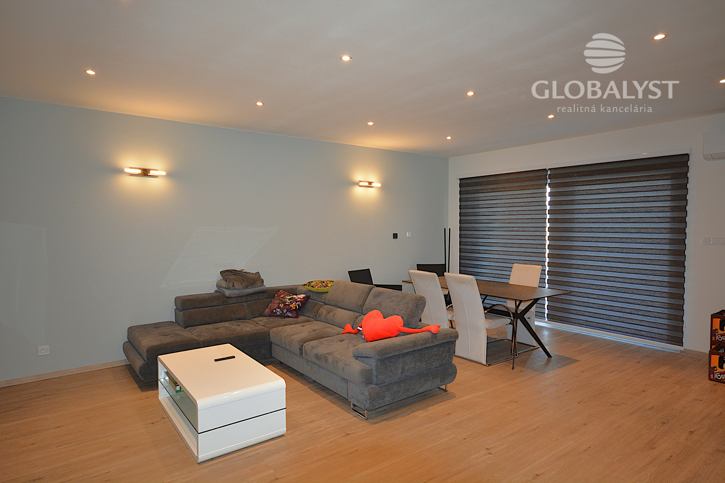 Dispozične pozostáva zo štyroch izieb – priestrannej obývačky prepojenej s kuchyňou a jedálenskou časťou, troch samostatných spální, dvoch kúpeľní s WC (jedna so sprchovacím kútom, druhá s rohovou vaňou) a technickej miestnosti/komory.